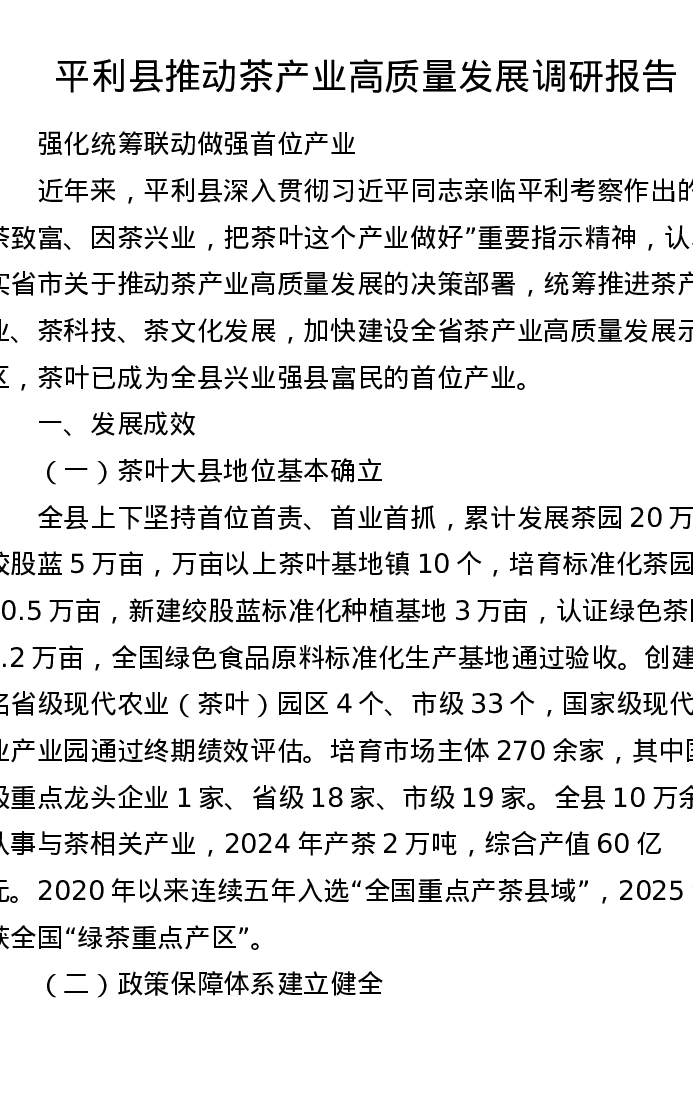 平利县推动茶产业高质量发展调研报告