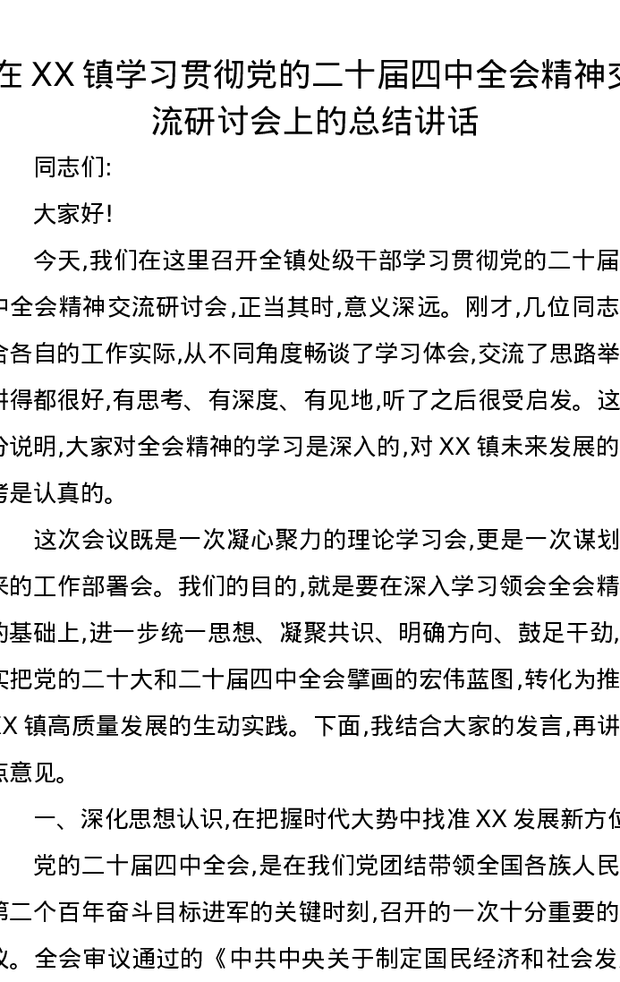 在XX镇学习贯彻党的二十届四中全会精神交流研讨会上的总结讲话