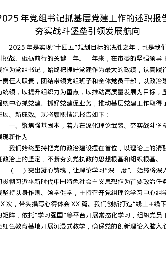 2025年党组书记抓基层党建工作的述职报告:夯实战斗堡垒 引领发展航向