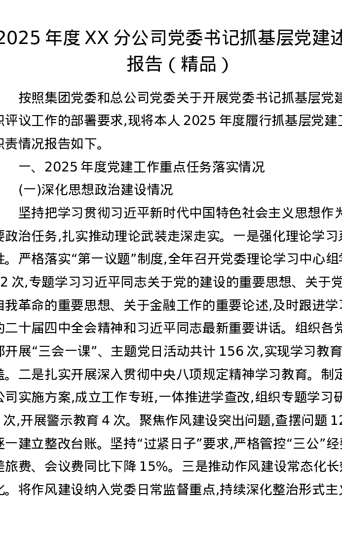 2025年度XX分公司党委书记抓基层党建述职报告