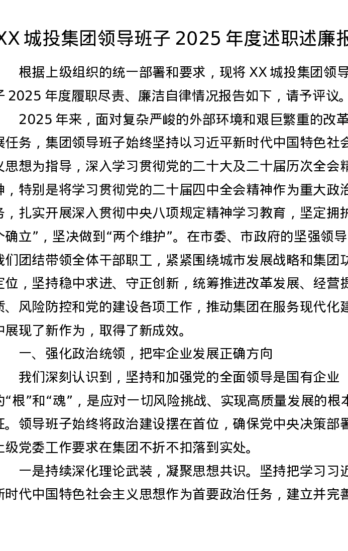 XX城投集团领导班子2025年度述职述廉报告