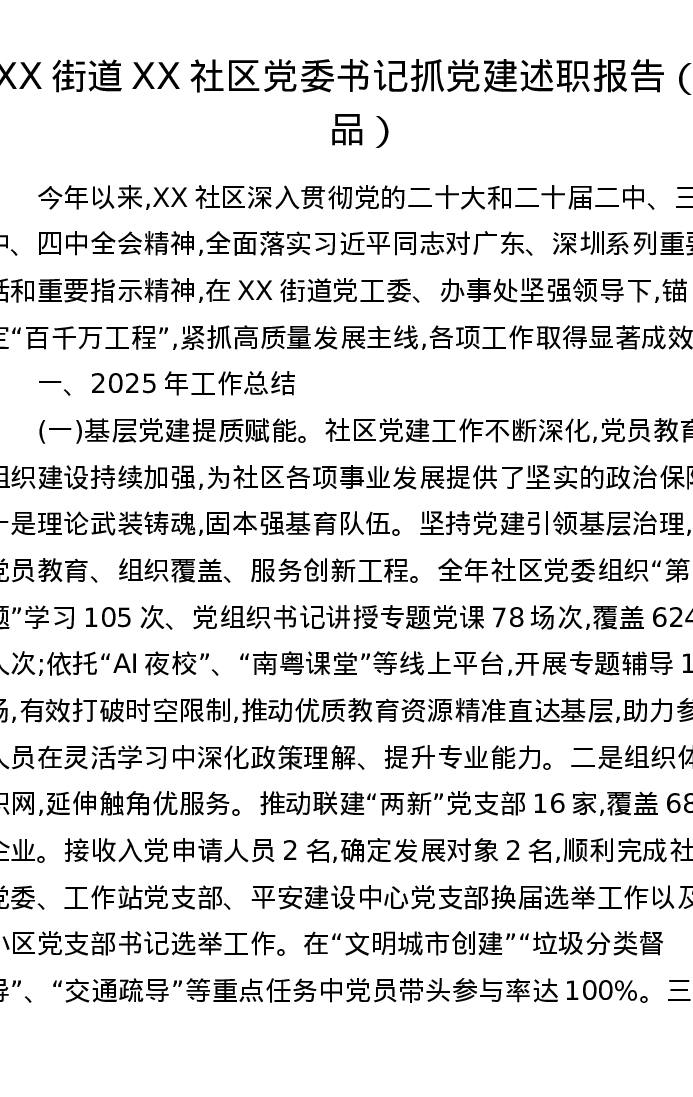 XX街道XX社区党委书记抓党建述职报告