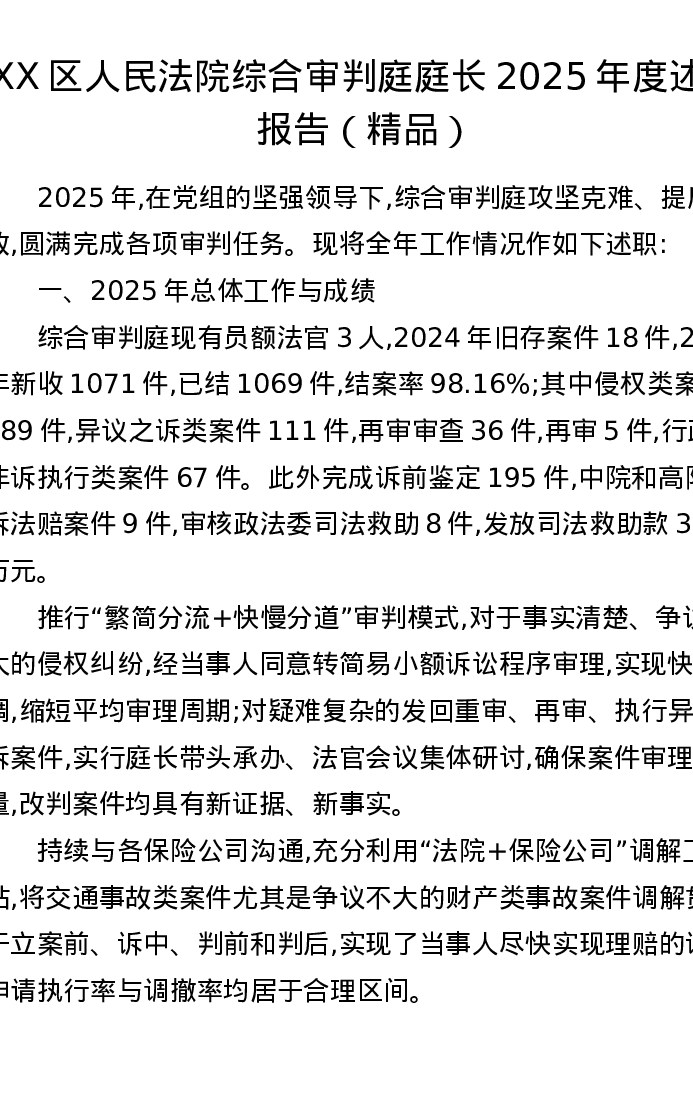 XX区人民法院综合审判庭庭长2025年度述职报告