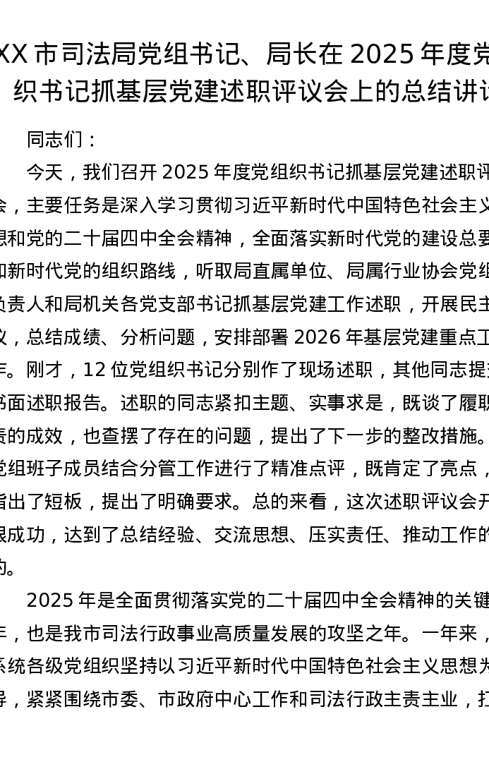 XX市司法局党组书记、局长在2025年度党组织书记抓基层党建述职评议会上的总结讲话(5630字)
