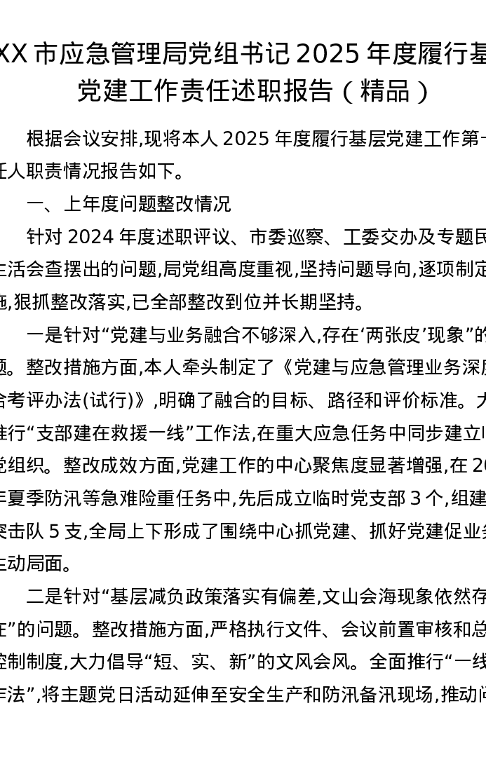 XX市应急管理局党组书记2025年度履行基层党建工作责任述职报告
