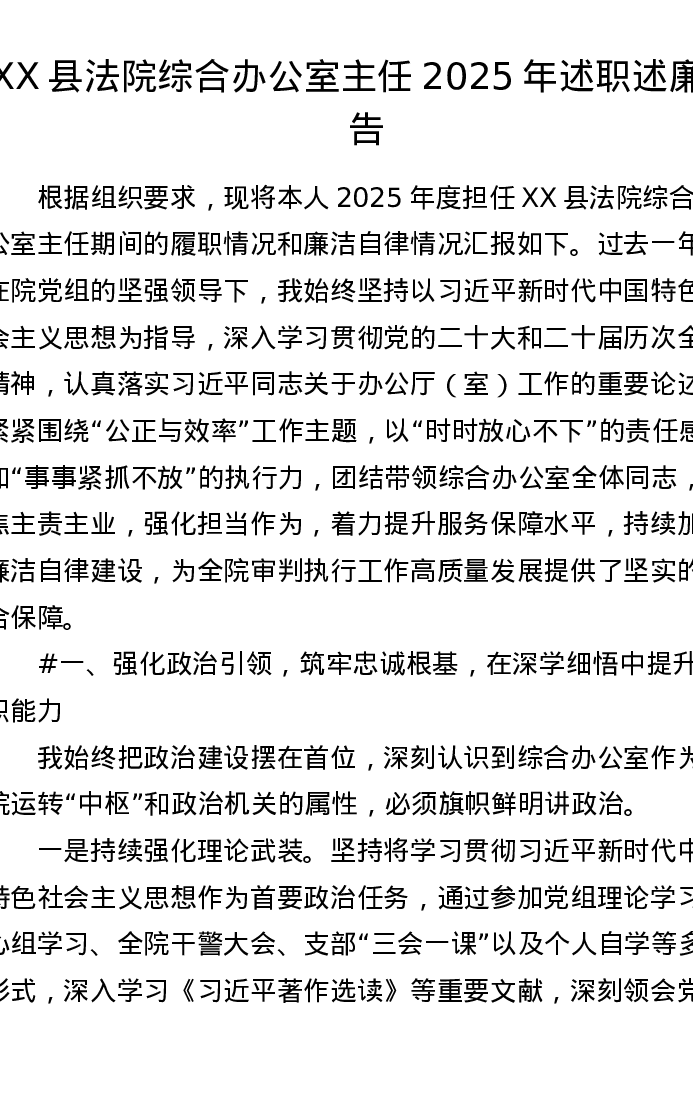 XX县法院综合办公室主任2025年述职述廉报告(3971字)