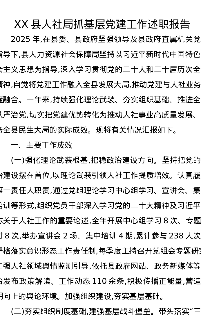 XX县人社局抓基层党建工作述职报告
