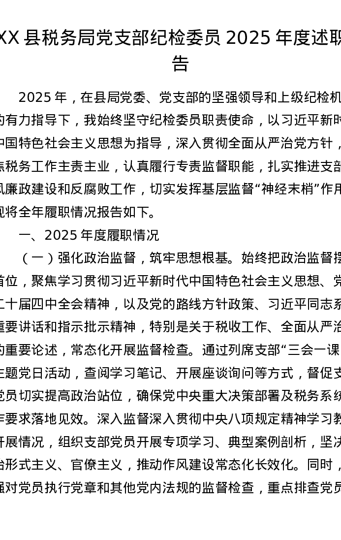 XX县税务局党支部纪检委员2025年度述职报告2