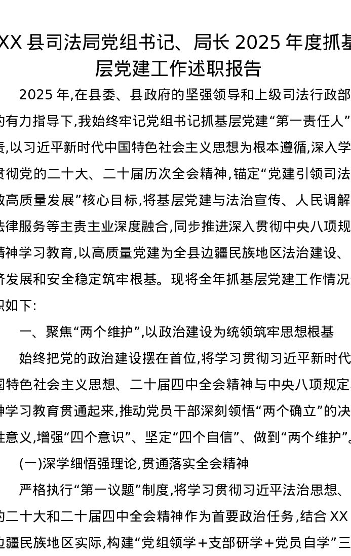 XX县司法局党组书记、局长2025年度抓基层党建工作述职报告