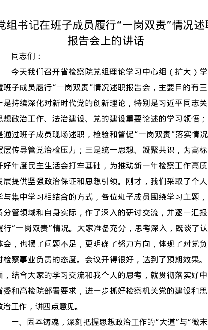 党组书记在班子成员履行一岗双责情况述职报告会上的讲话