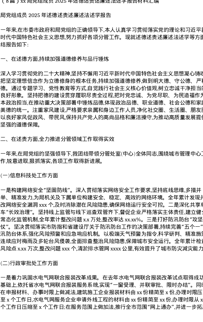汇编:xx局党组成员2025年述德述责述廉述法述学报告材料8篇
