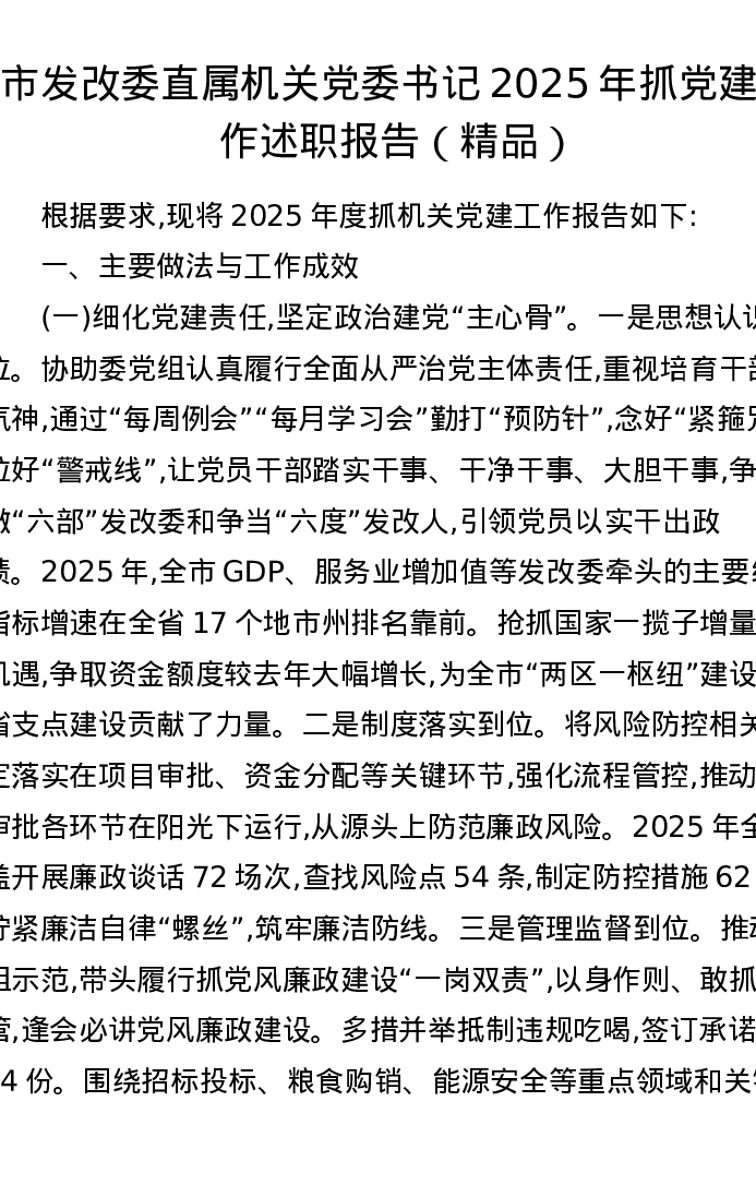 市发改委直属机关党委书记2025年抓党建工作述职报告