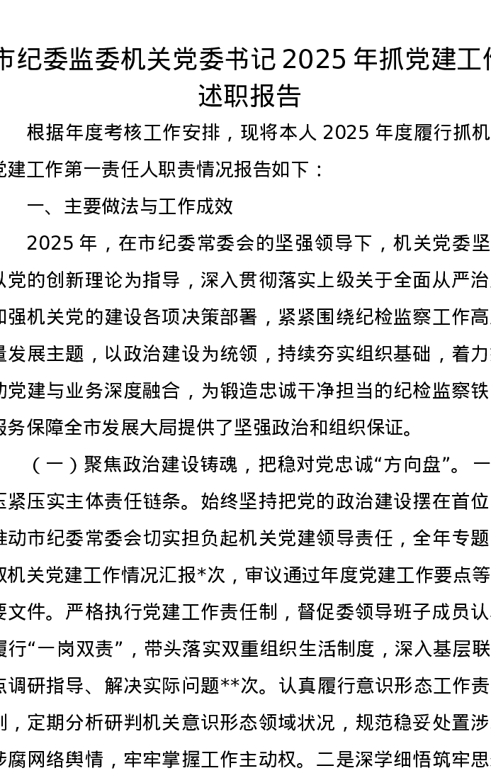 市纪委监委机关党委书记 2025年抓党建工作述职报告
