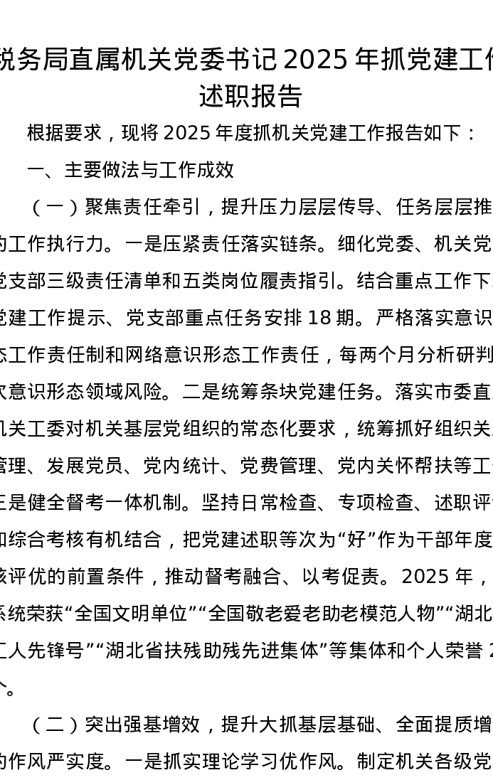 税务局直属机关党委书记2025年抓党建工作述职报告