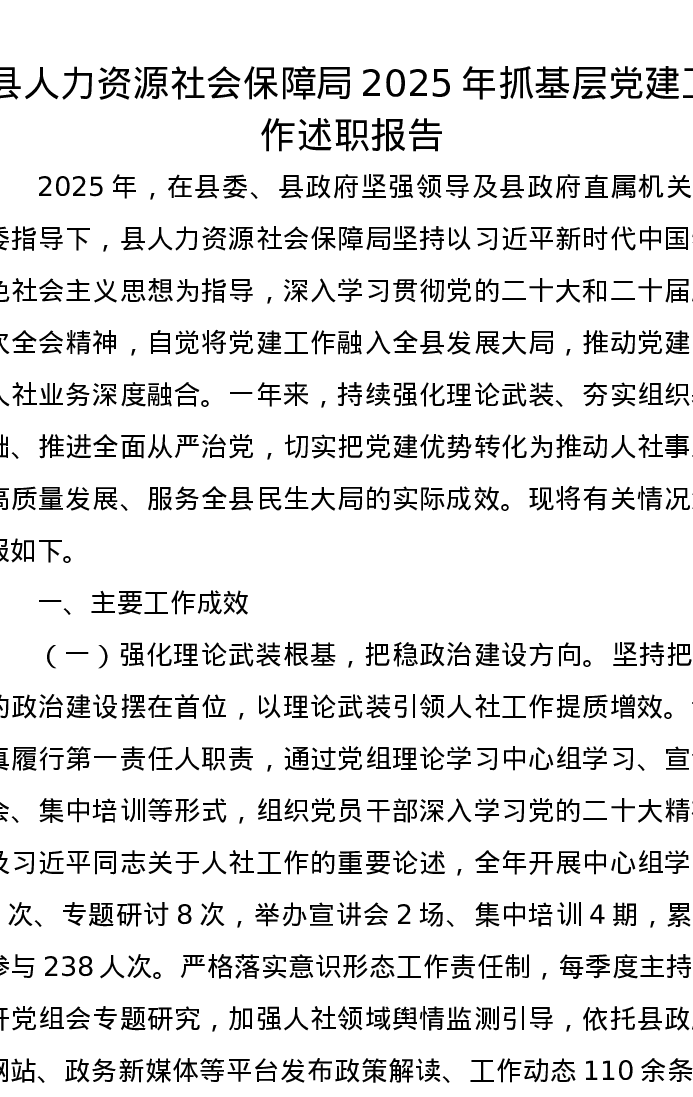 县人力资源社会保障局2025年抓基层党建工作述职报告