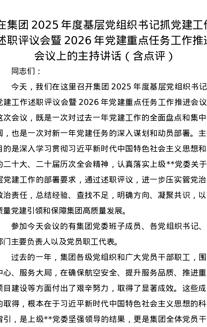 在集团2025年度基层党组织书记抓党建工作述职评议会暨2026年党建重点任务工作推进会议上的主持讲话(含点评)