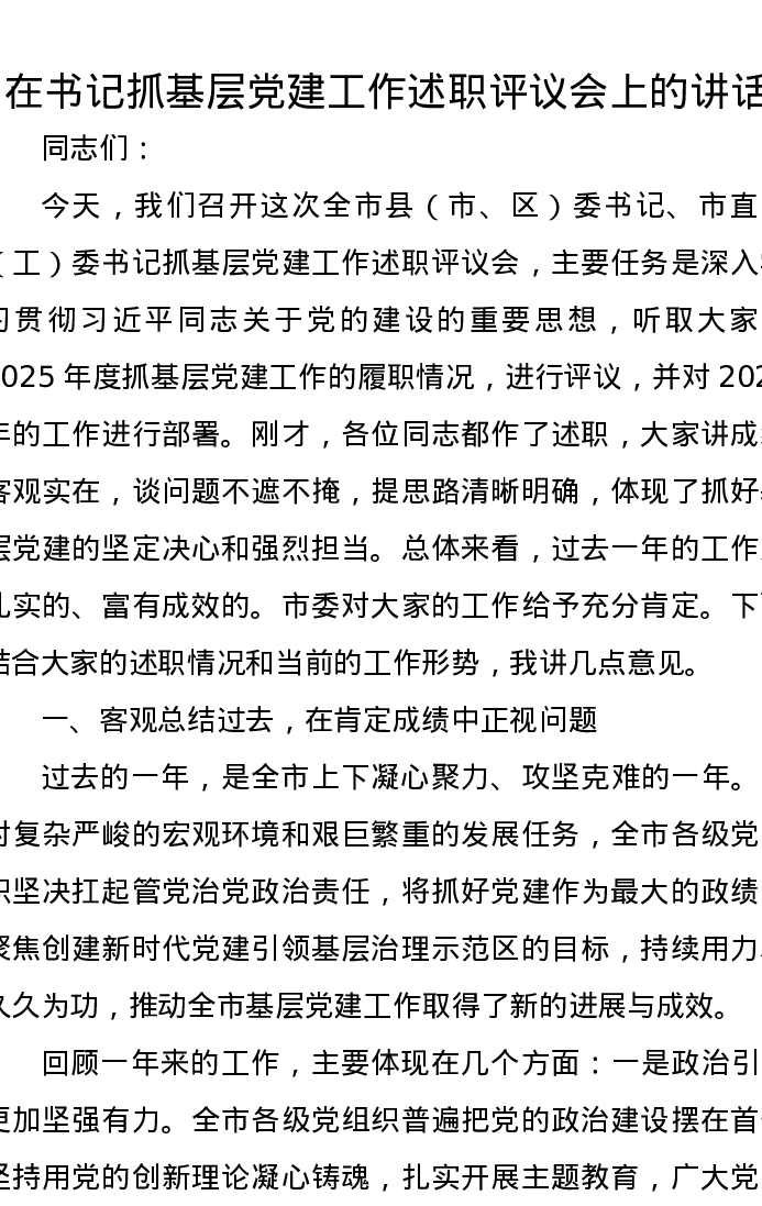 在书记抓基层党建工作述职评议会上的讲话