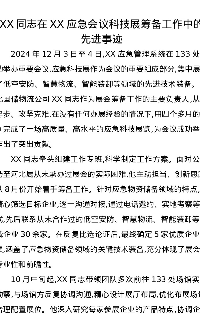 XX同志在XX应急会议科技展筹备工作中的先进事迹