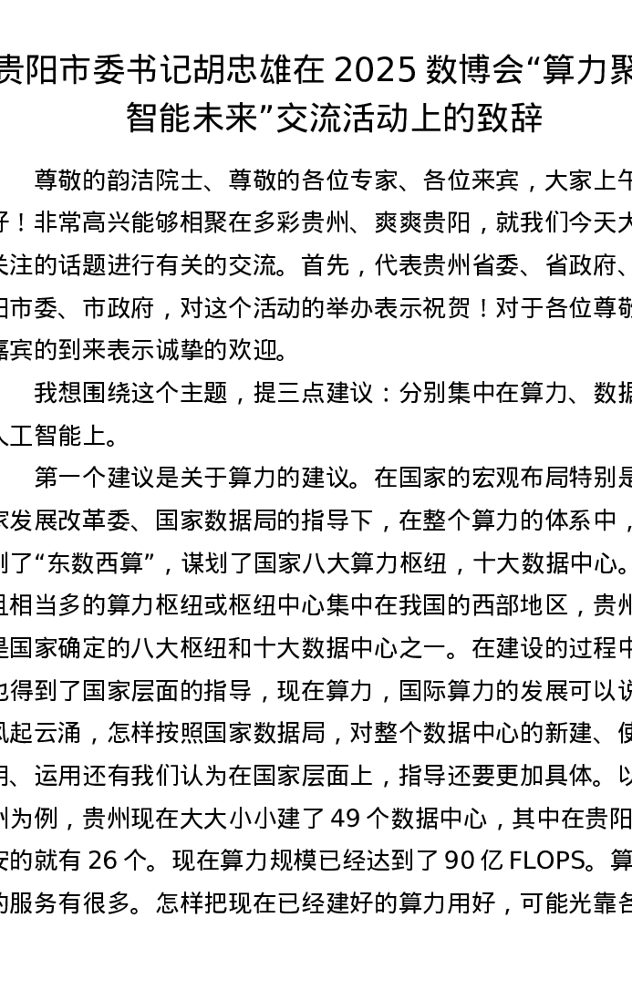 贵阳市委书记胡忠雄在2025数博会算力聚势智能未来交流活动上的致辞