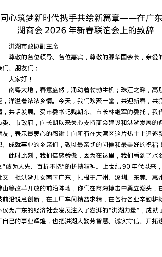 同心筑梦新时代 携手共绘新篇章——在广东洪湖商会2026年新春联谊会上的致辞