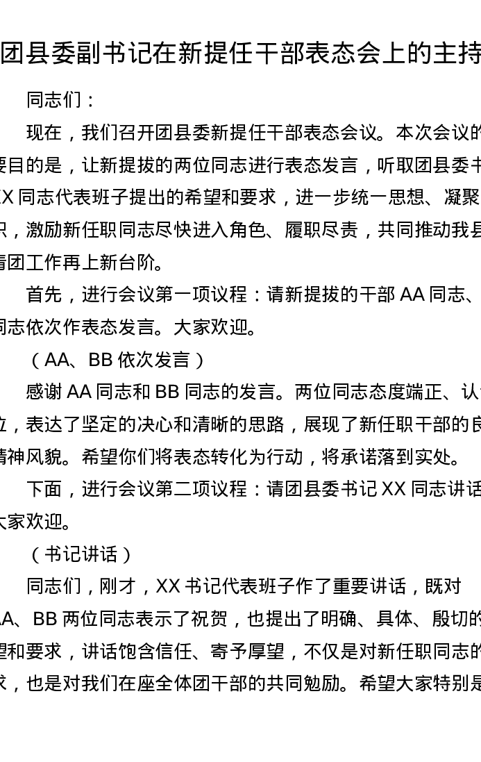 团县委副书记在新提任干部表态会上的主持词(611字)