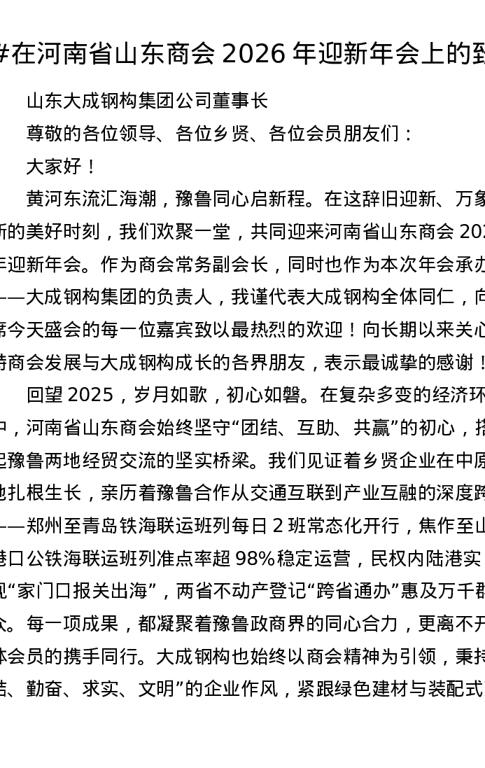 在河南省山东商会2026年迎新年会上的致辞