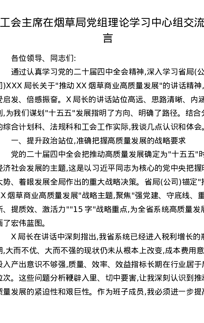 工会主席在烟草局党组理论学习中心组交流发言