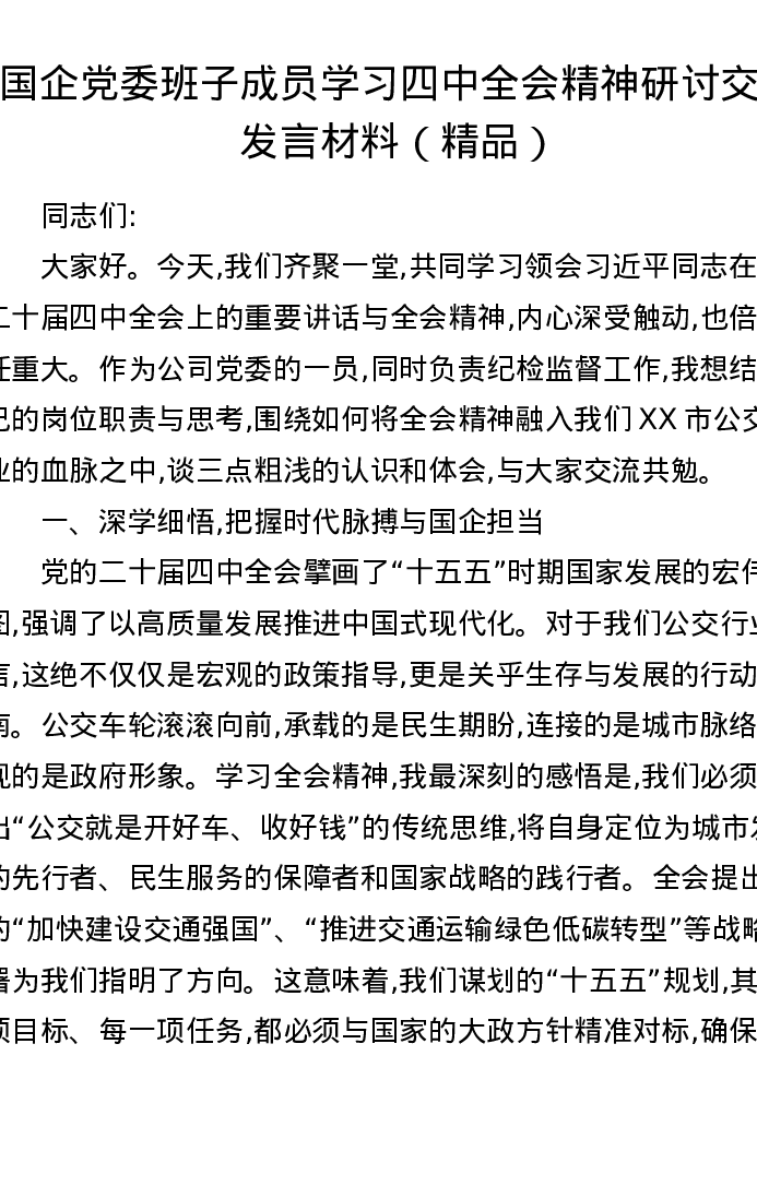 国企党委班子成员学习四中全会精神研讨交流发言材料