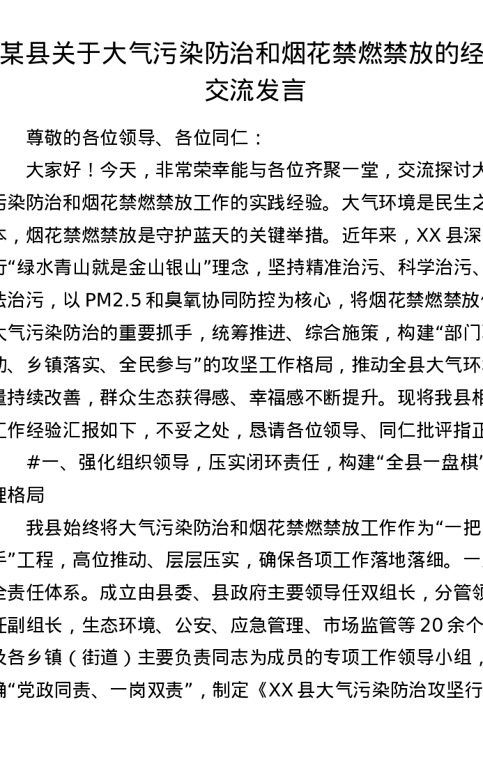 某县关于大气污染防治和烟花禁燃禁放的经验交流发言(3357字)