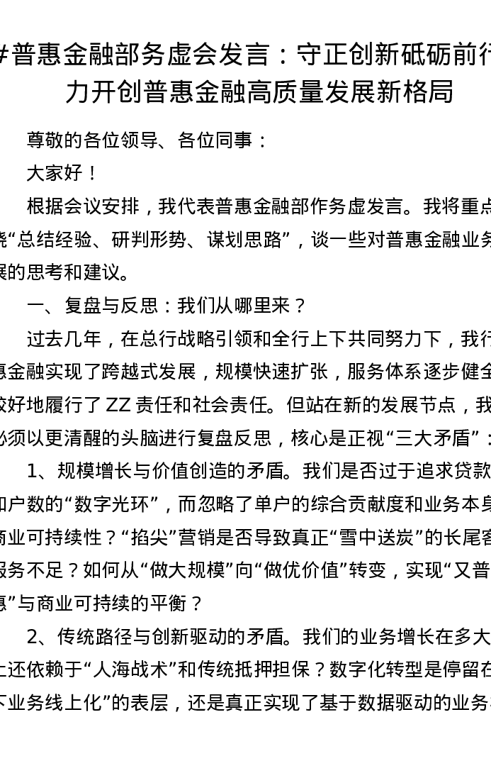 普惠金融部务虚会发言:守正创新 砥砺前行 奋力开创普惠金融高质量发展新格局