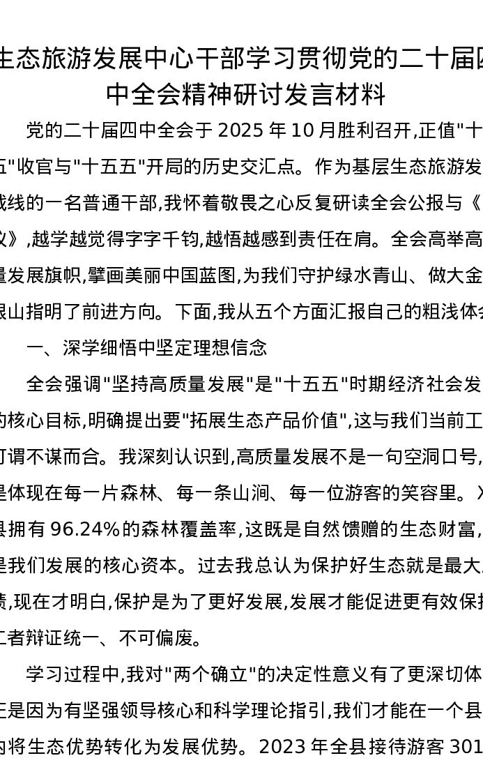 生态旅游发展中心干部学习贯彻党的二十届四中全会精神研讨发言材料