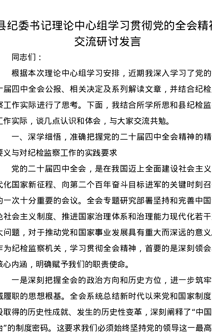 县纪委书记理论中心组学习贯彻党的全会精神交流研讨发言