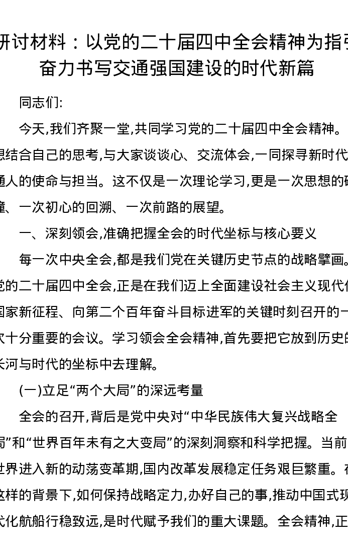 研讨发言:以党的二十届四中全会精神为指引奋力书写交通强国建设的时代新篇