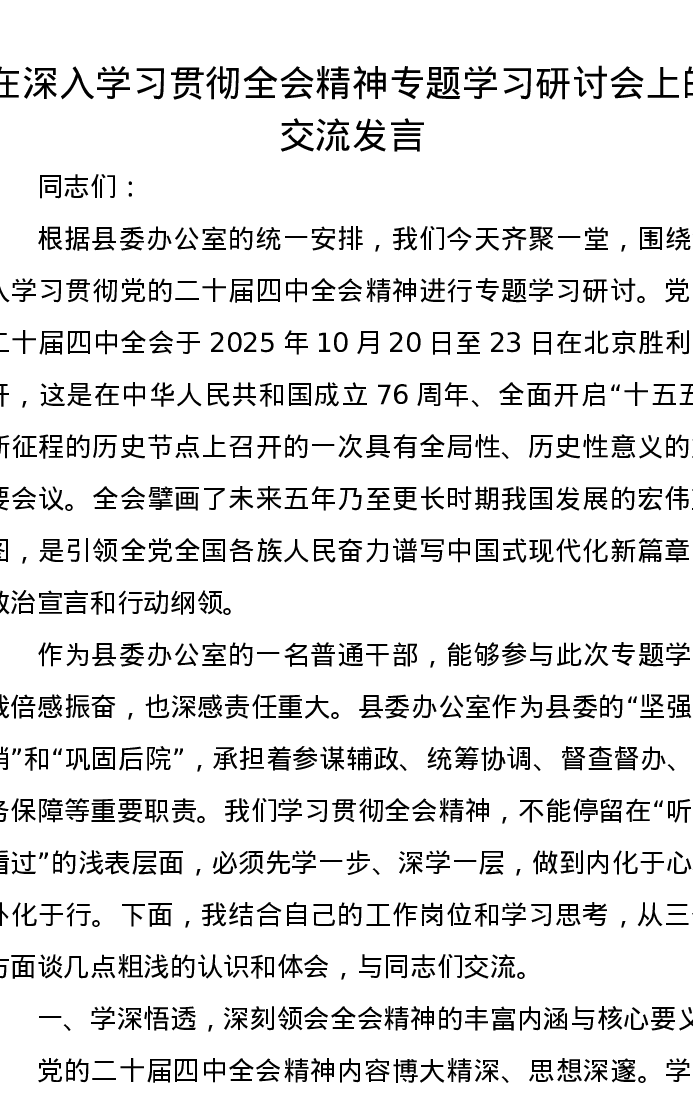 在深入学习贯彻二十届四中全会精神专题学习研讨会上的交流发言