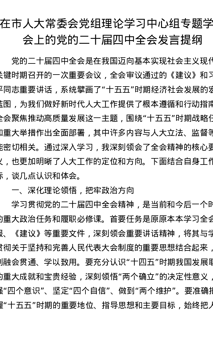在市人大常委会党组理论学习中心组专题学习会上的党的二十届四中全会发言提纲