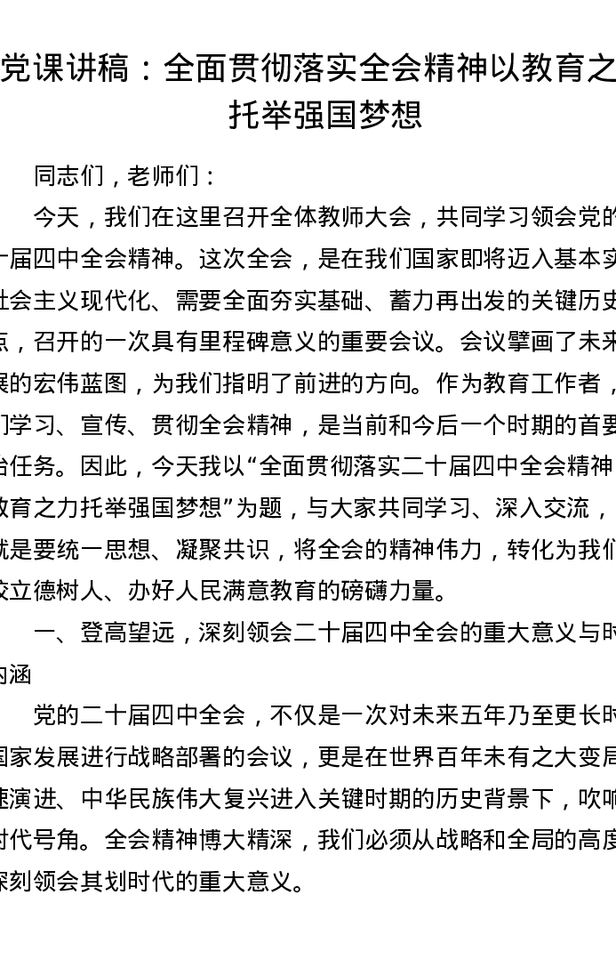 党课讲稿:全面贯彻落实全会精神 以教育之力托举强国梦想