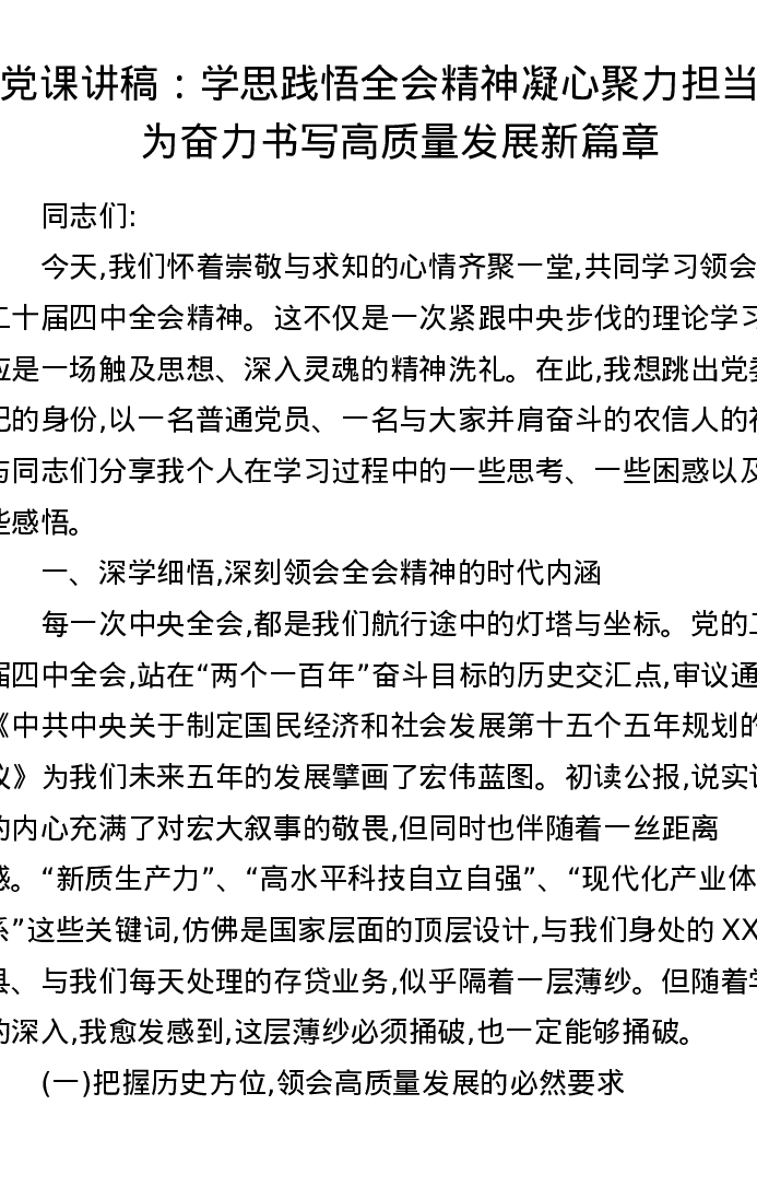 党课讲稿:学思践悟全会精神 凝心聚力担当作为 奋力书写高质量发展新篇章