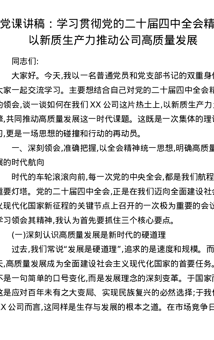党课讲稿:学习贯彻党的二十届四中全会精神以新质生产力推动公司高质量发展