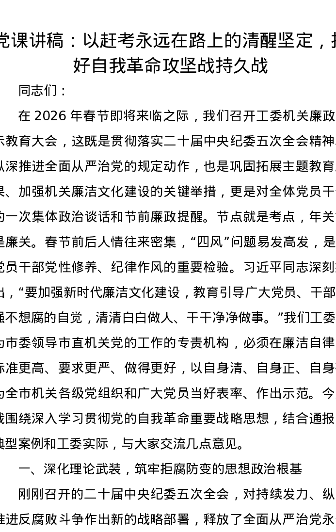 党课讲稿:以赶考永远在路上的清醒坚定,打好自我革命攻坚战持久战