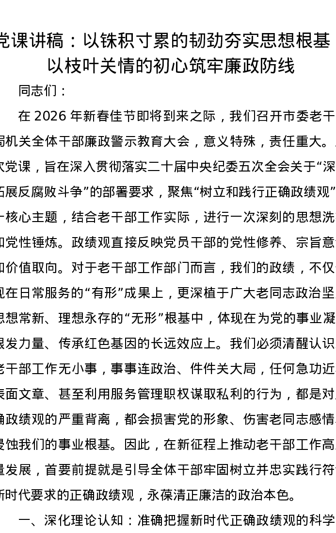 党课讲稿:以铢积寸累的韧劲夯实思想根基,以枝叶关情的初心筑牢廉政防线