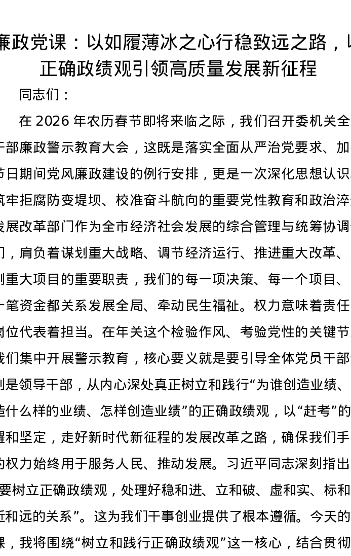 廉政党课:以如履薄冰之心行稳致远之路,以正确政绩观引领高质量发展新征程