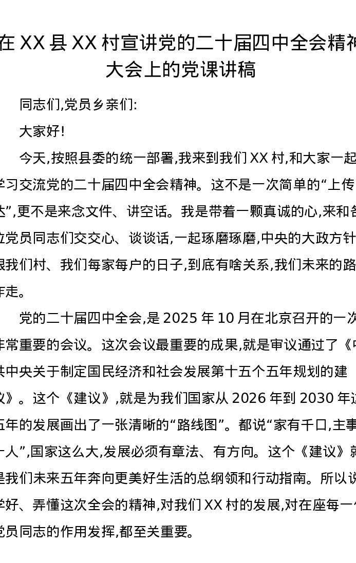 在XX县XX村宣讲党的二十届四中全会精神大会上的党课讲稿
