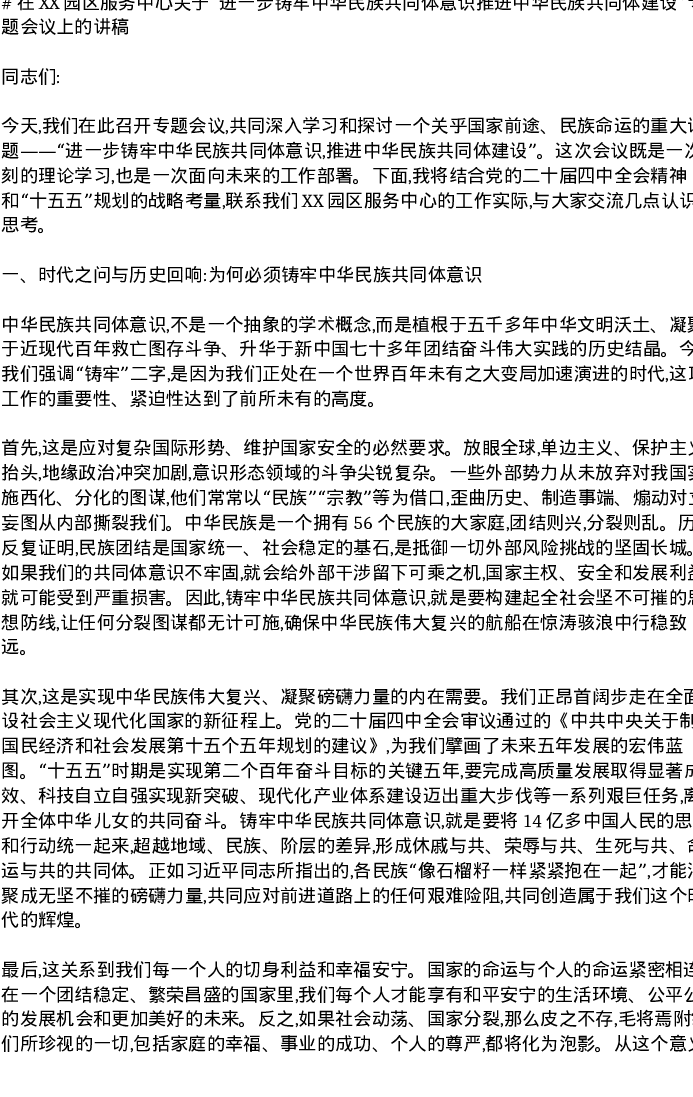 在XX园区服务中心关于进一步铸牢中华民族共同体意识推进中华民族共同体建设专题会议上的讲稿