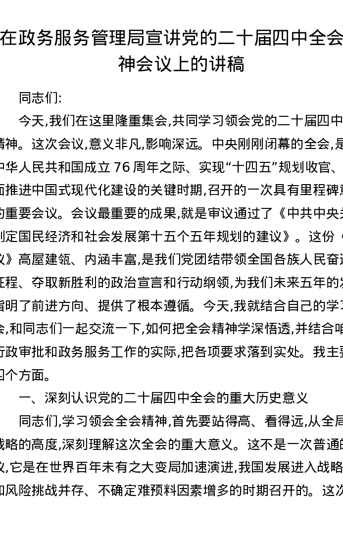 在政务服务管理局宣讲党的二十届四中全会精神会议上的讲稿