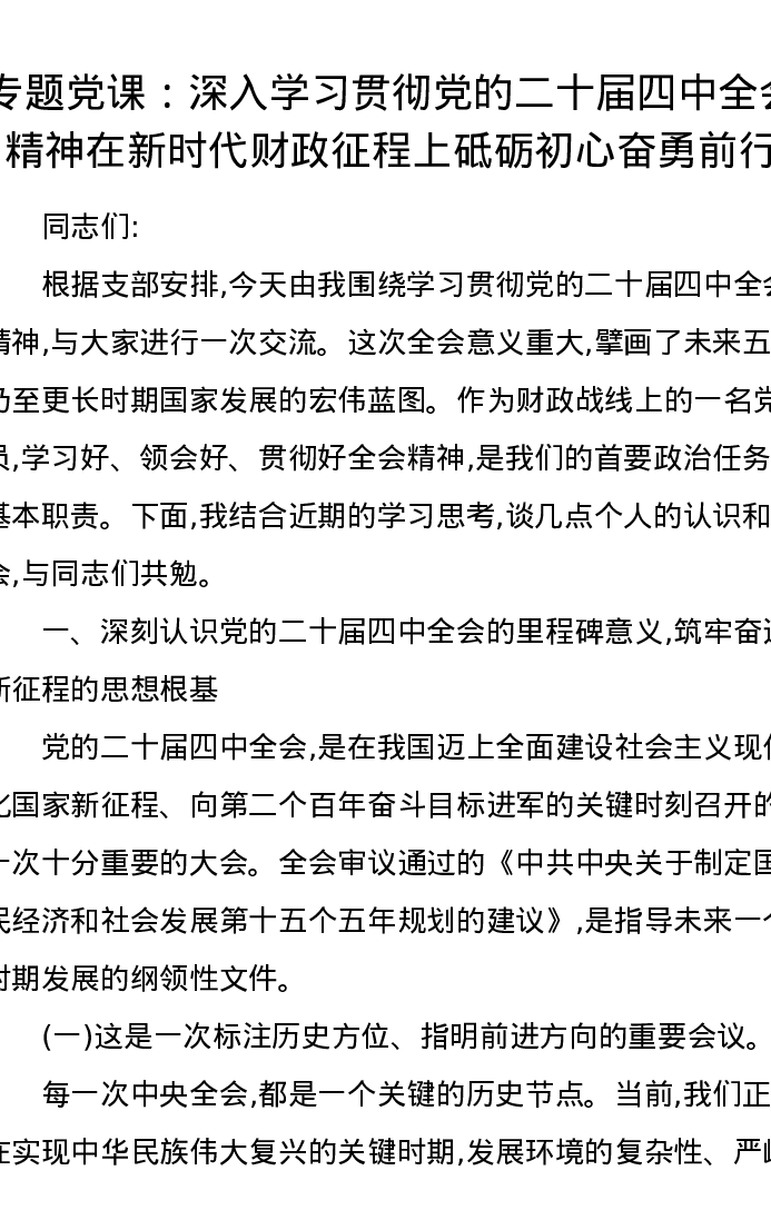 专题党课:深入学习贯彻党的二十届四中全会精神在新时代财政征程上砥砺初心奋勇前行