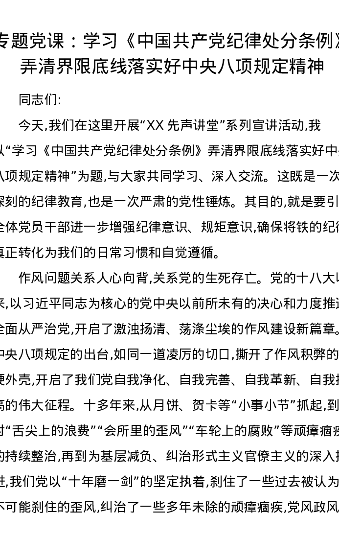 专题党课:学习《中国共产党纪律处分条例》弄清界限底线落实好中央八项规定精神