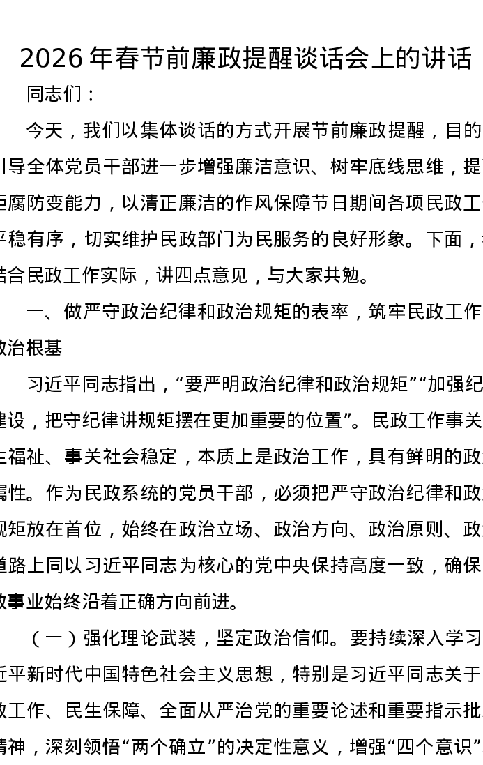 2026年春节前廉政提醒谈话会上的讲话