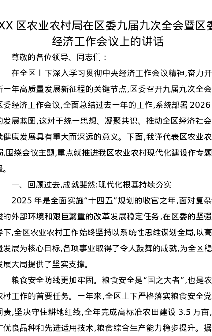XX区农业农村局在区委九届九次全会暨区委经济工作会议上的讲话(2)