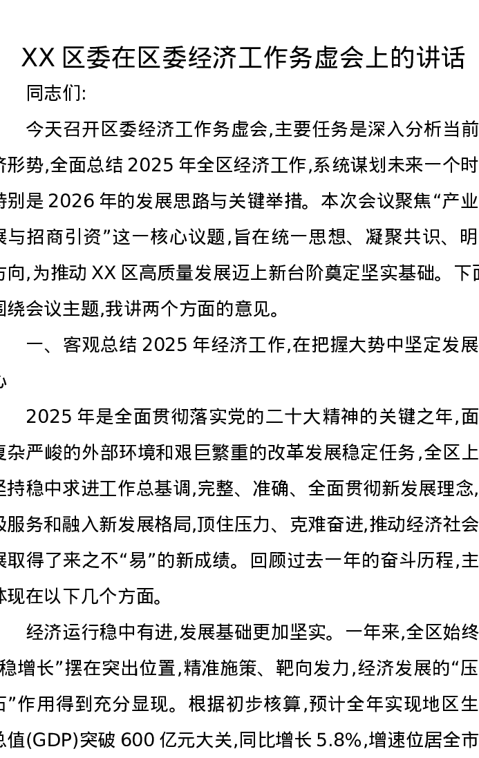 XX区委在区委经济工作务虚会上的讲话