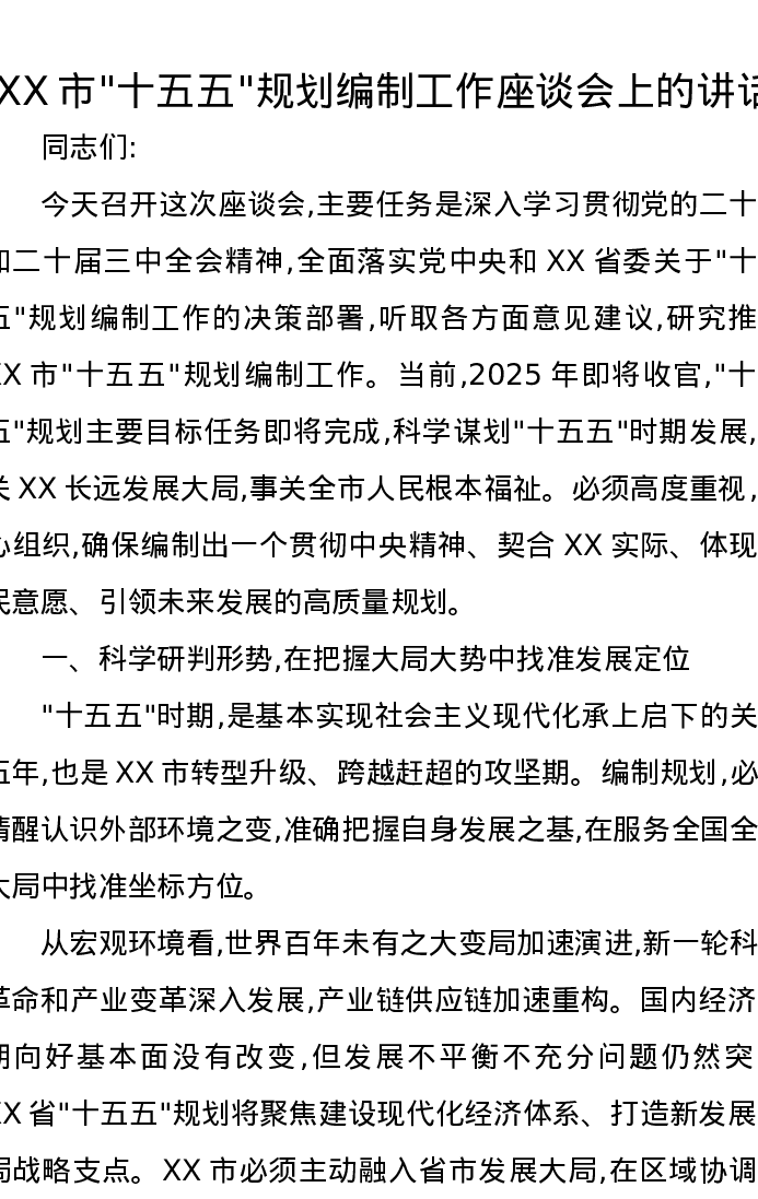 XX市十五五规划编制工作座谈会上的讲话